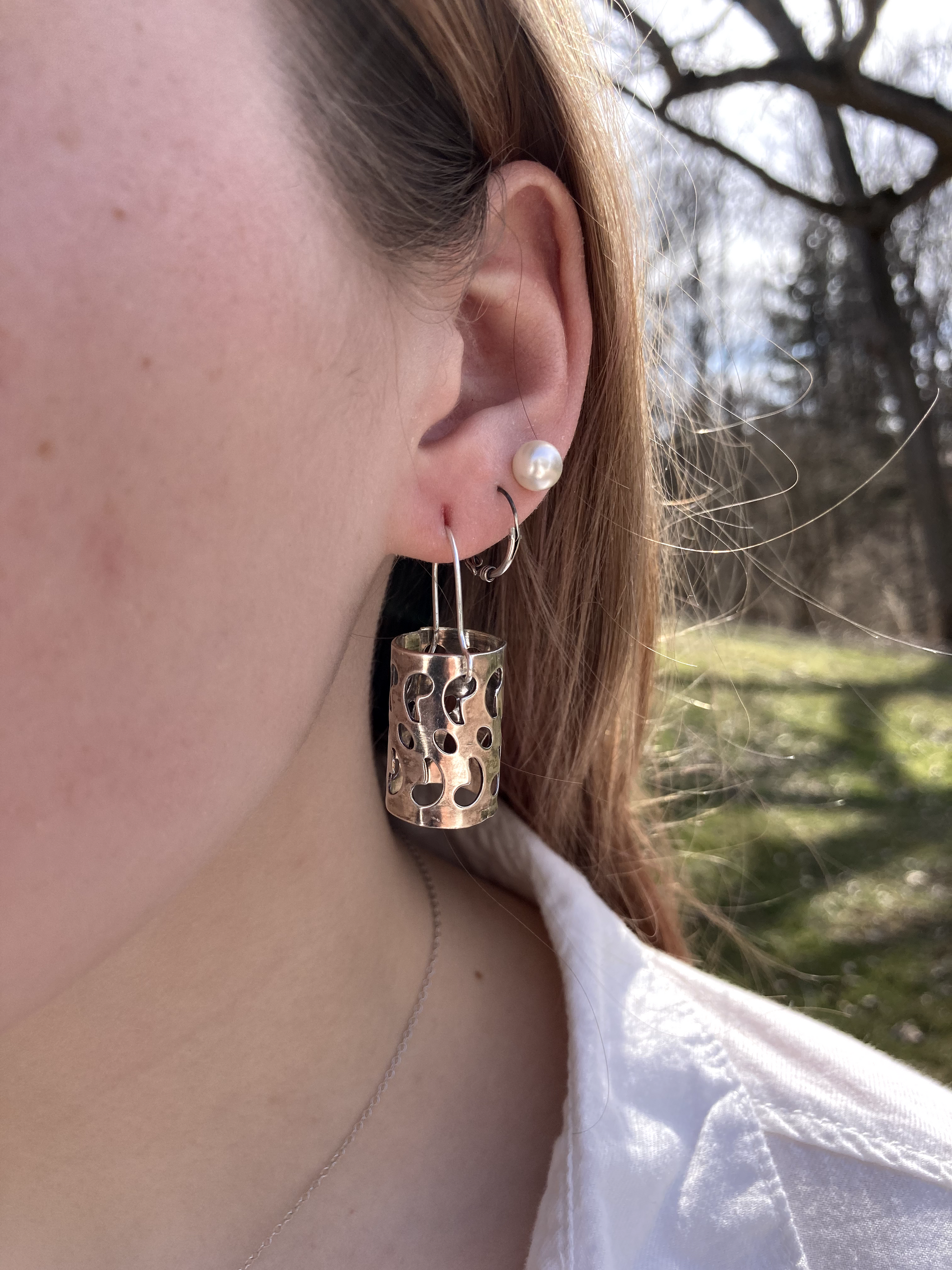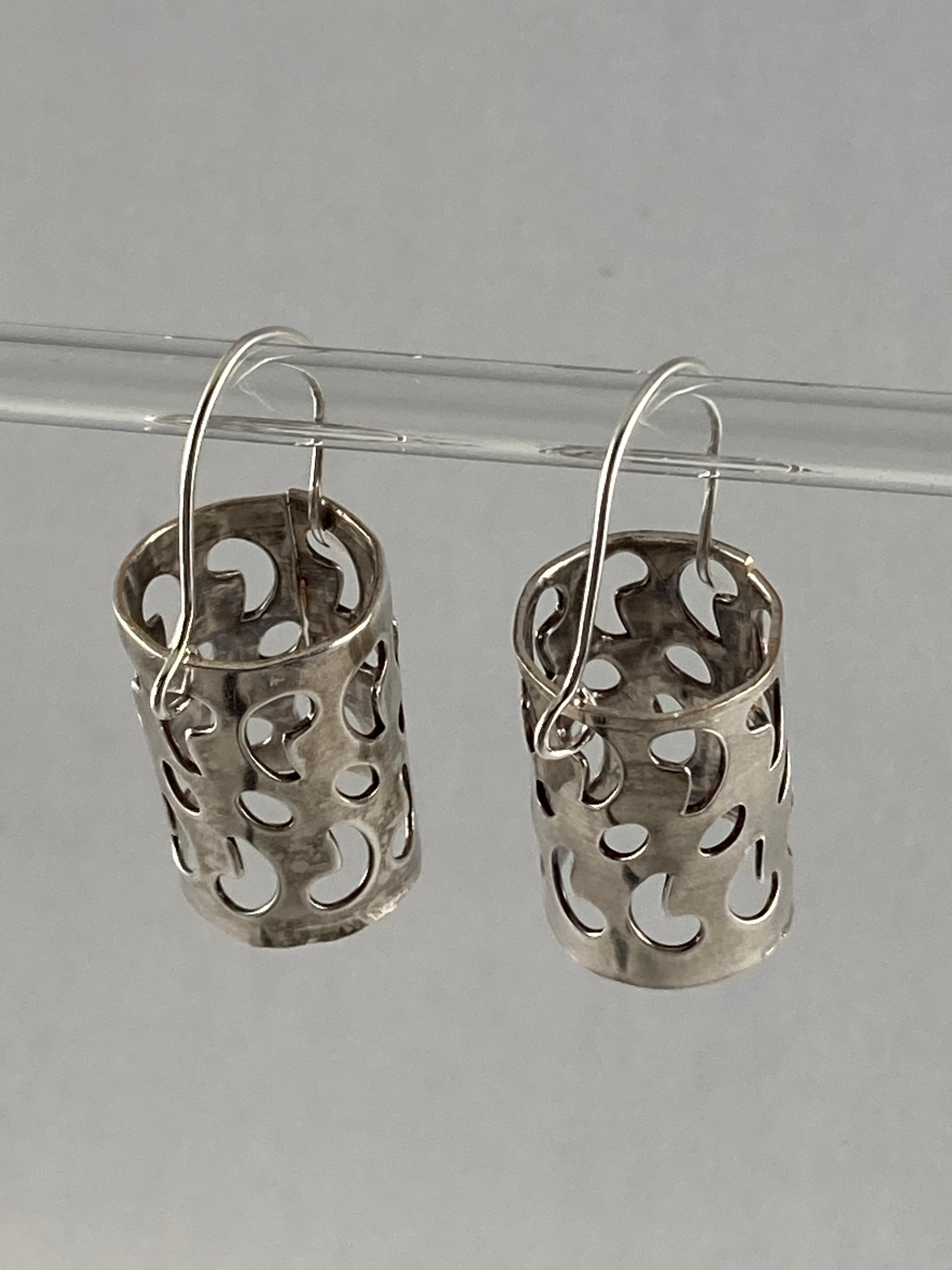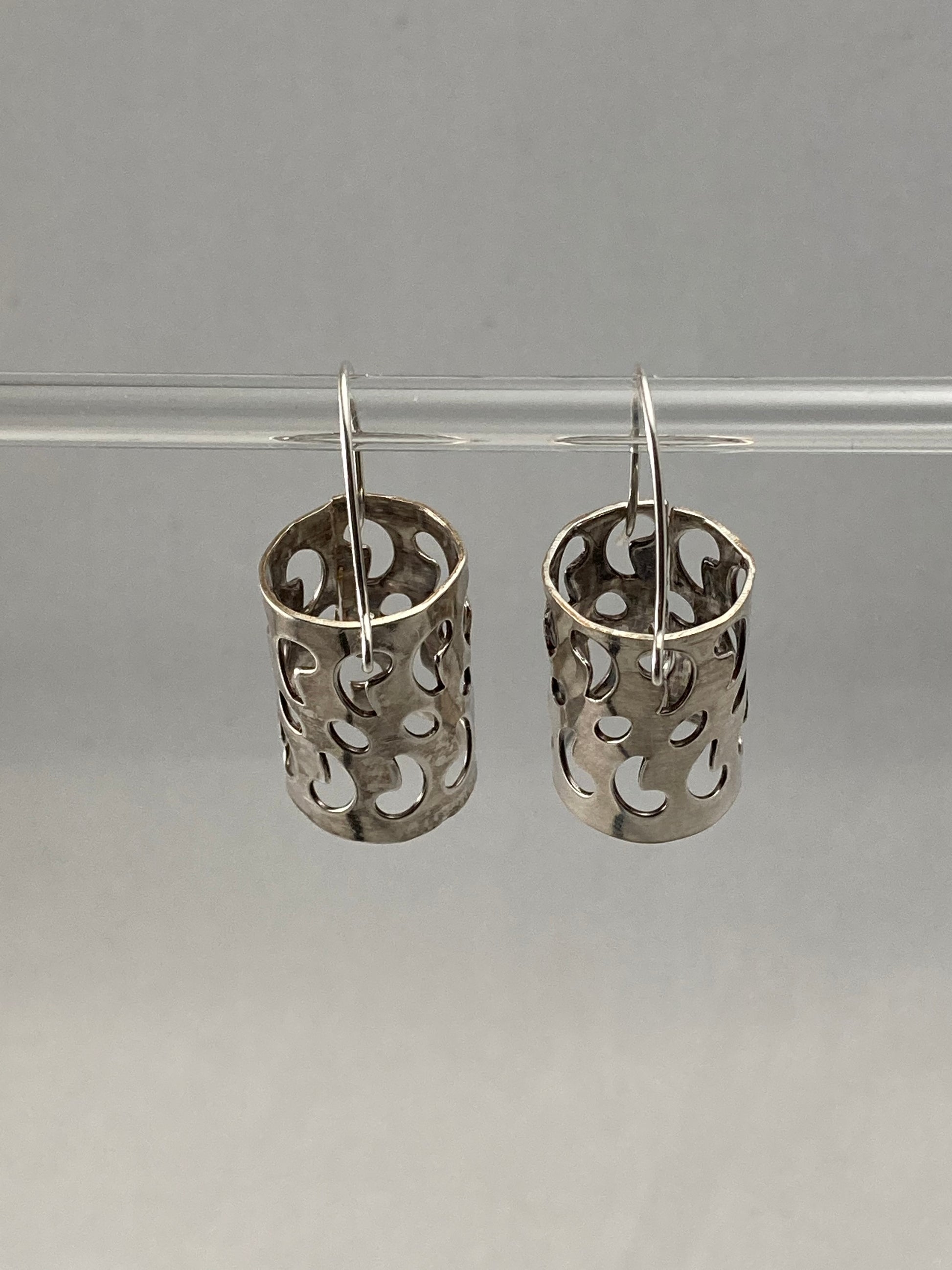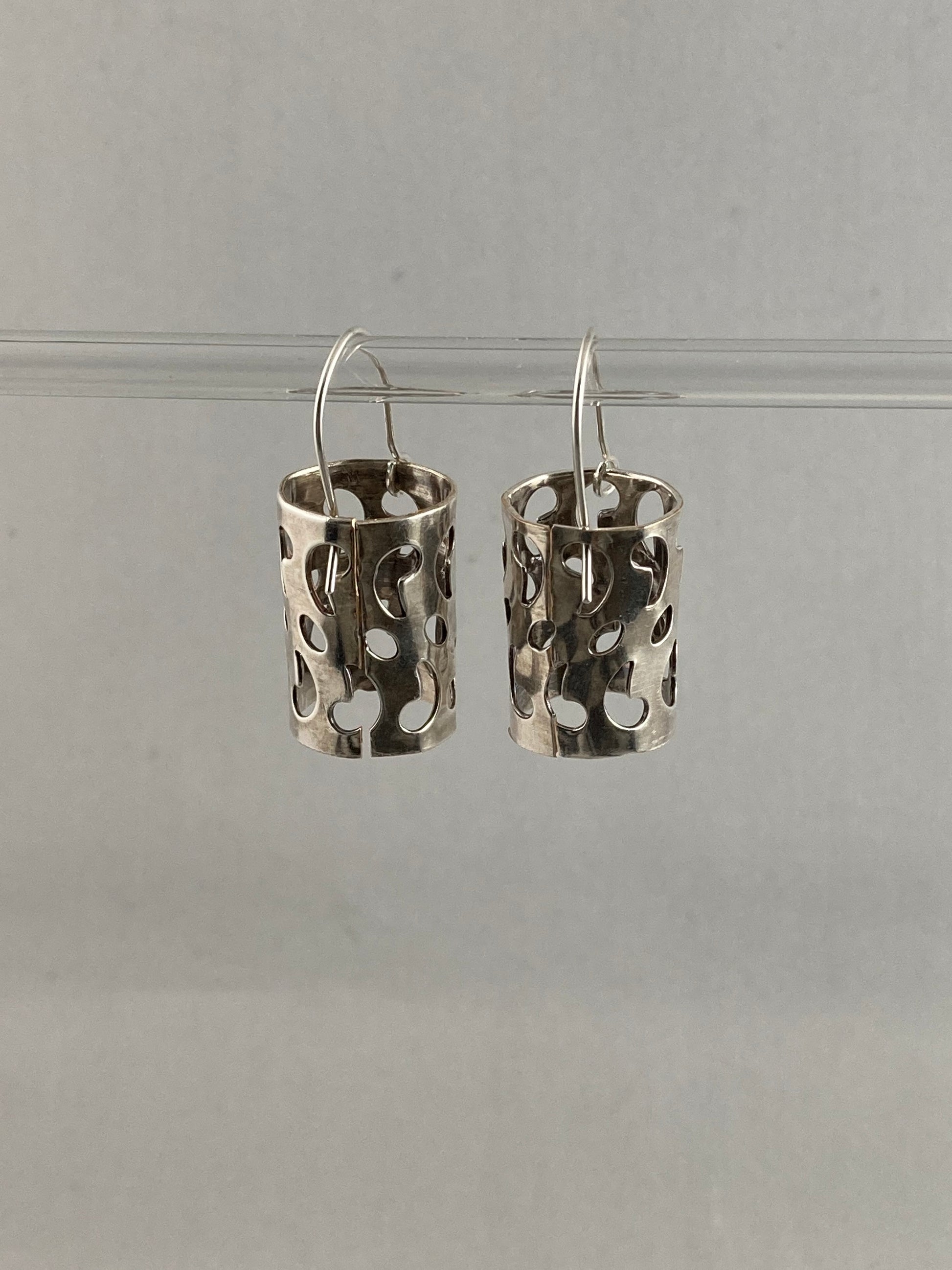 A unique handmade silver dangle earrings created from a casserole dish