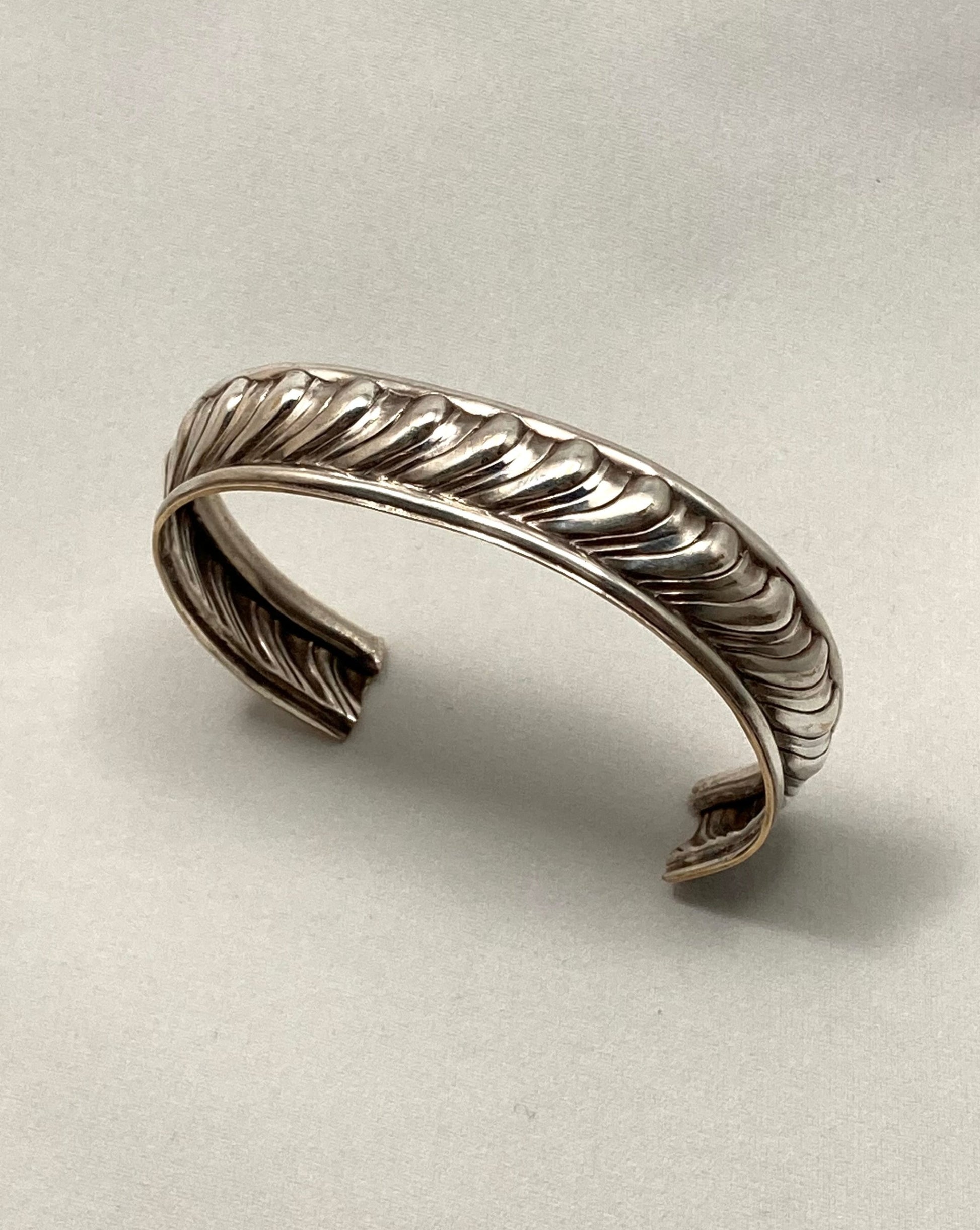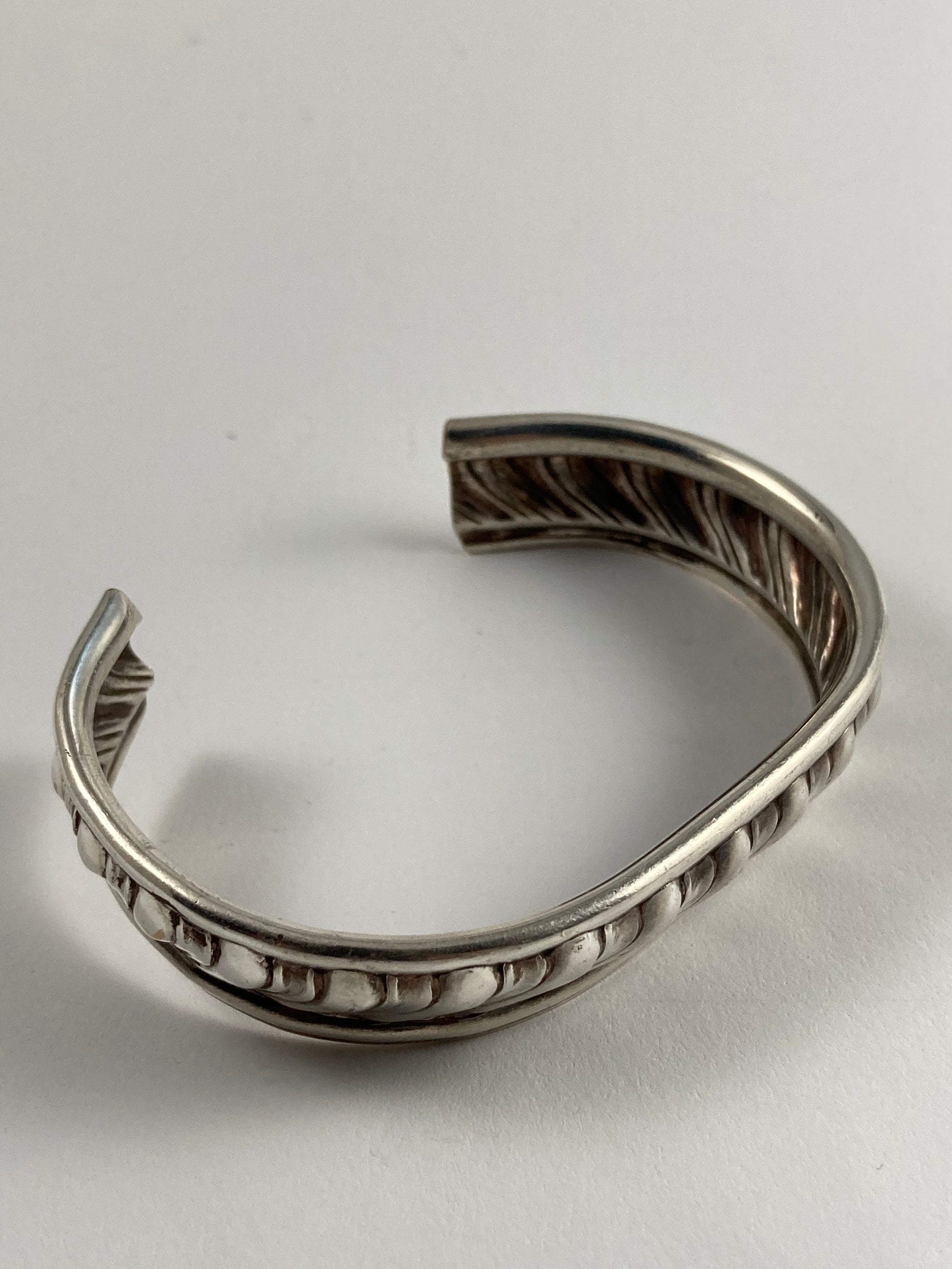 Imagine wearing a bracelet that has served more than just a style statement. The Heirloom Cuff is crafted from a 50+ year-old sterling silver plated serving platter.